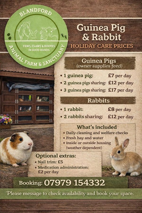 By choosing the Blandford Animal Farm & Sanctuary for your pets holiday stay you are not only ensuring the best care but also supporting all our beautiful animals here at the farm.
